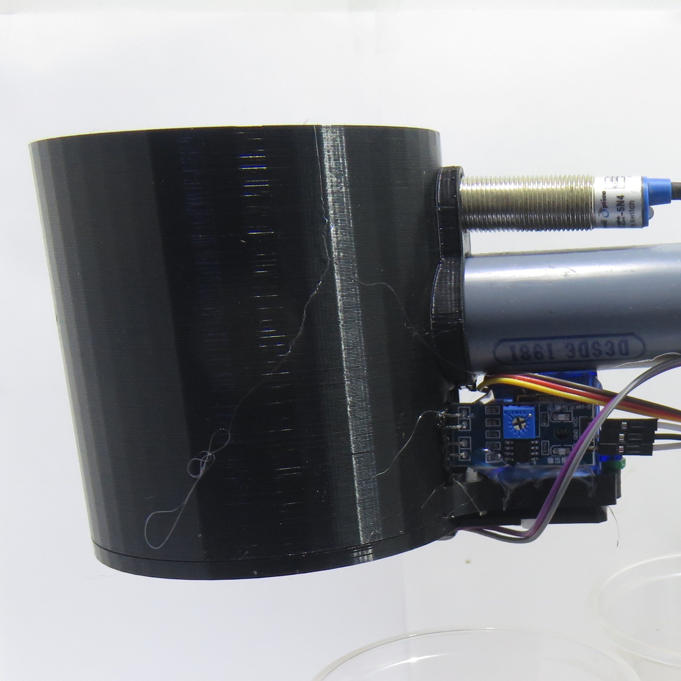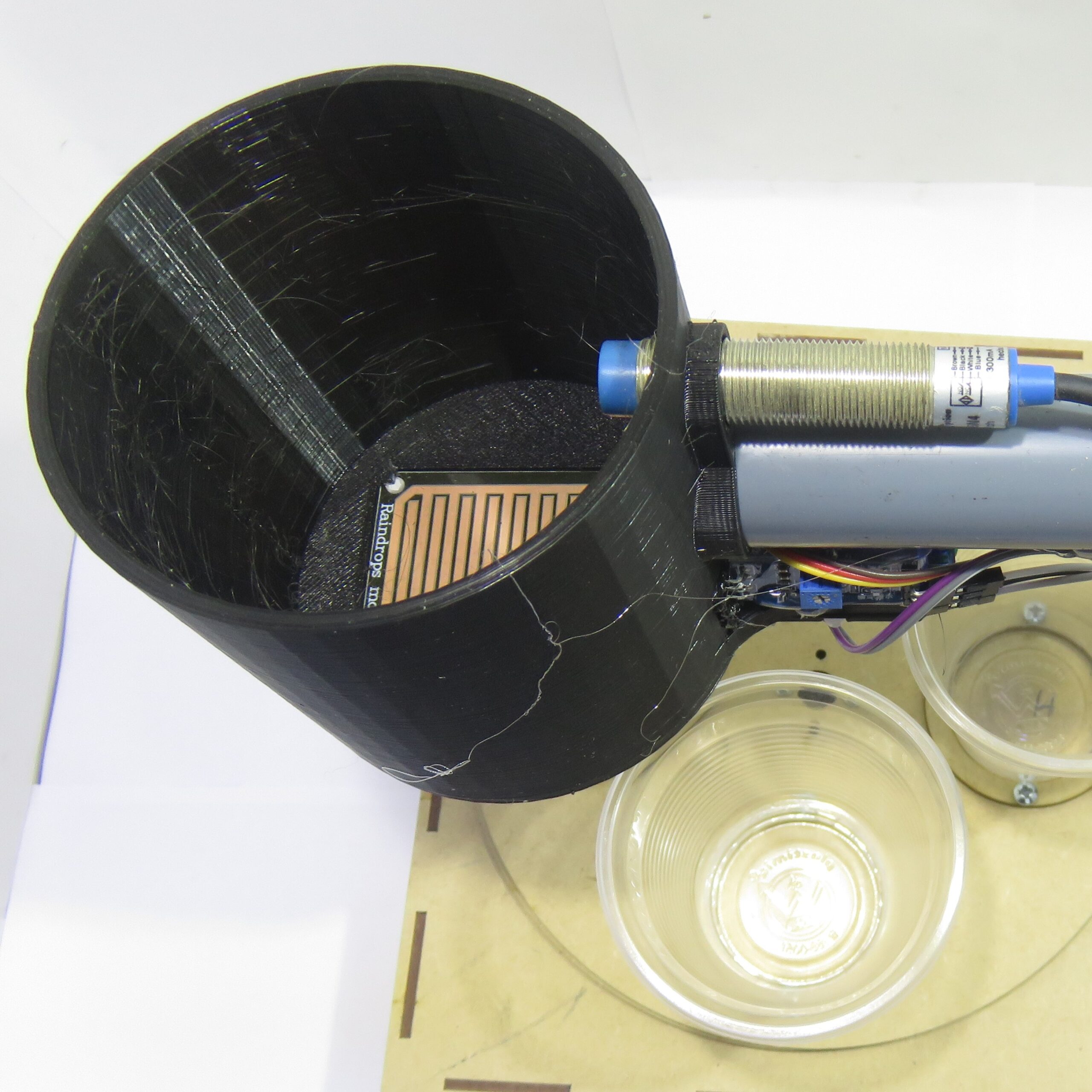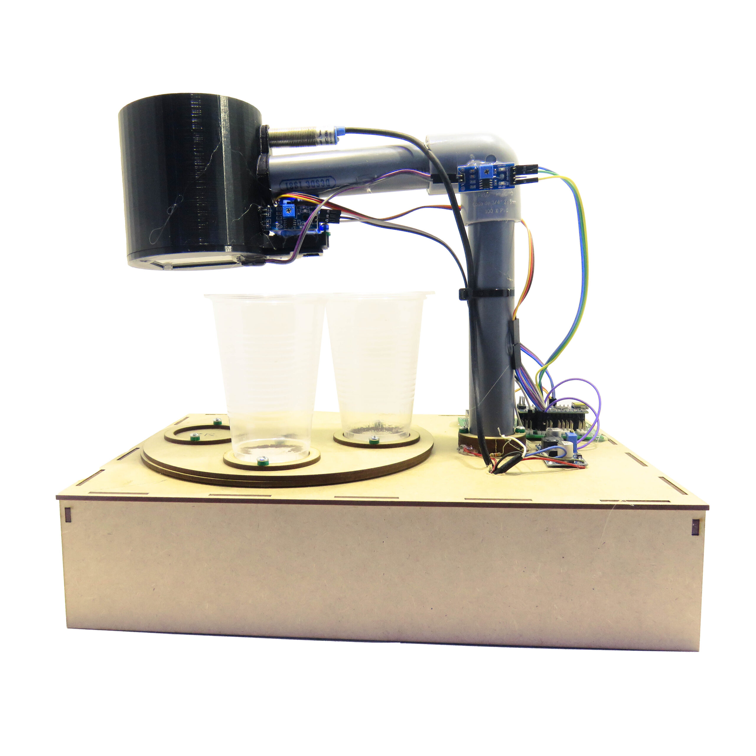 Esta máquina es un sistema de clasificación de objetos diseñado con un cilindro de PLA que integra múltiples sensores para la detección. Un sensor de lluvia verifica si el objeto introducido está húmedo, un sensor inductivo determina si se trata de un material metálico o no metálico, y un sensor infrarrojo detecta la presencia del objeto dentro del cilindro. Una vez realizada la clasificación, una compuerta inferior controlada por servomotores se abre, dejando caer el objeto sobre una plataforma giratoria que contiene espacios para vasos, evitando que el suelo se manche. La estructura está construida principalmente en MDF, y todo el sistema electrónico es gestionado por un Arduino Nano con su shield correspondiente, encargado tanto de la alimentación de los sensores como del control de los servomotores